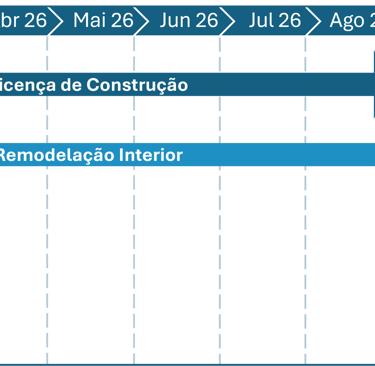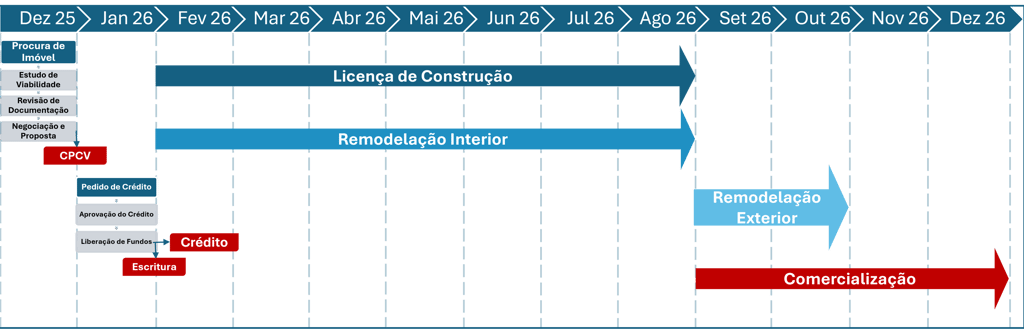 Este cronograma apresenta as etapas principais do projeto, incluindo a compra do imóvel, execução da remodelação, obtenção de licenças e a fase de comercialização.
